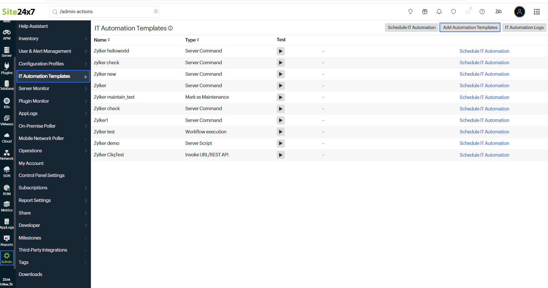 - 左側のメニューから、[管理]→[IT自動化テンプレート]に移動します。