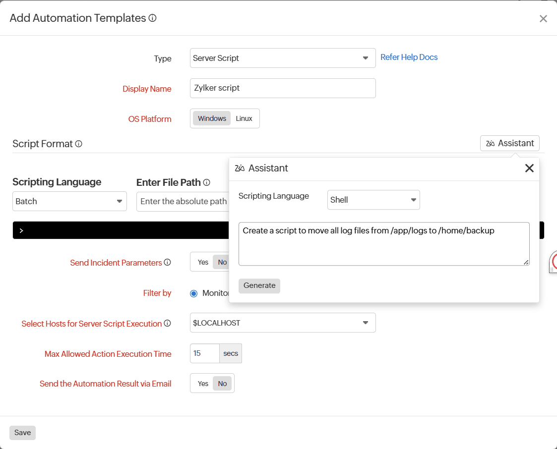 IT自動化では、サーバースクリプトとサーバーコマンドに対してのみAsk Ziaを使用できます。