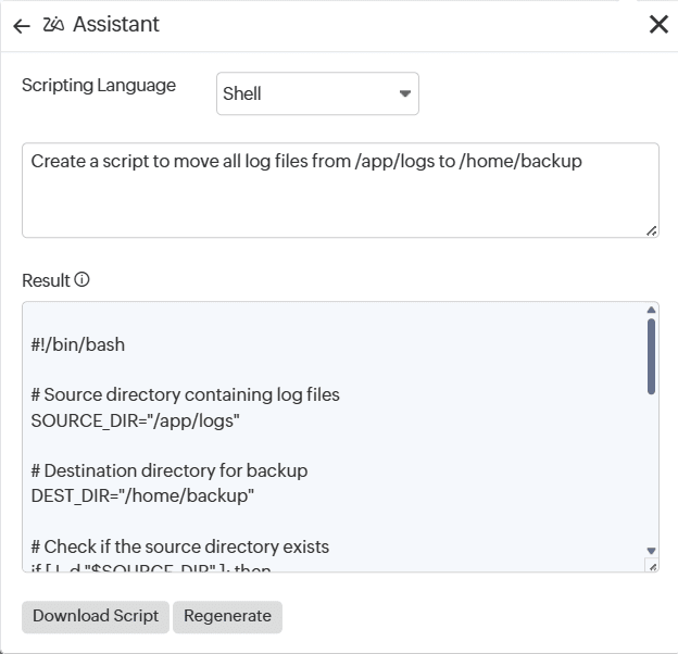 - Zia Assistantのポップアップで、スクリプト言語を選択し、必要なスクリプトを説明する自然言語プロンプトを入力して、[生成]をクリックします。