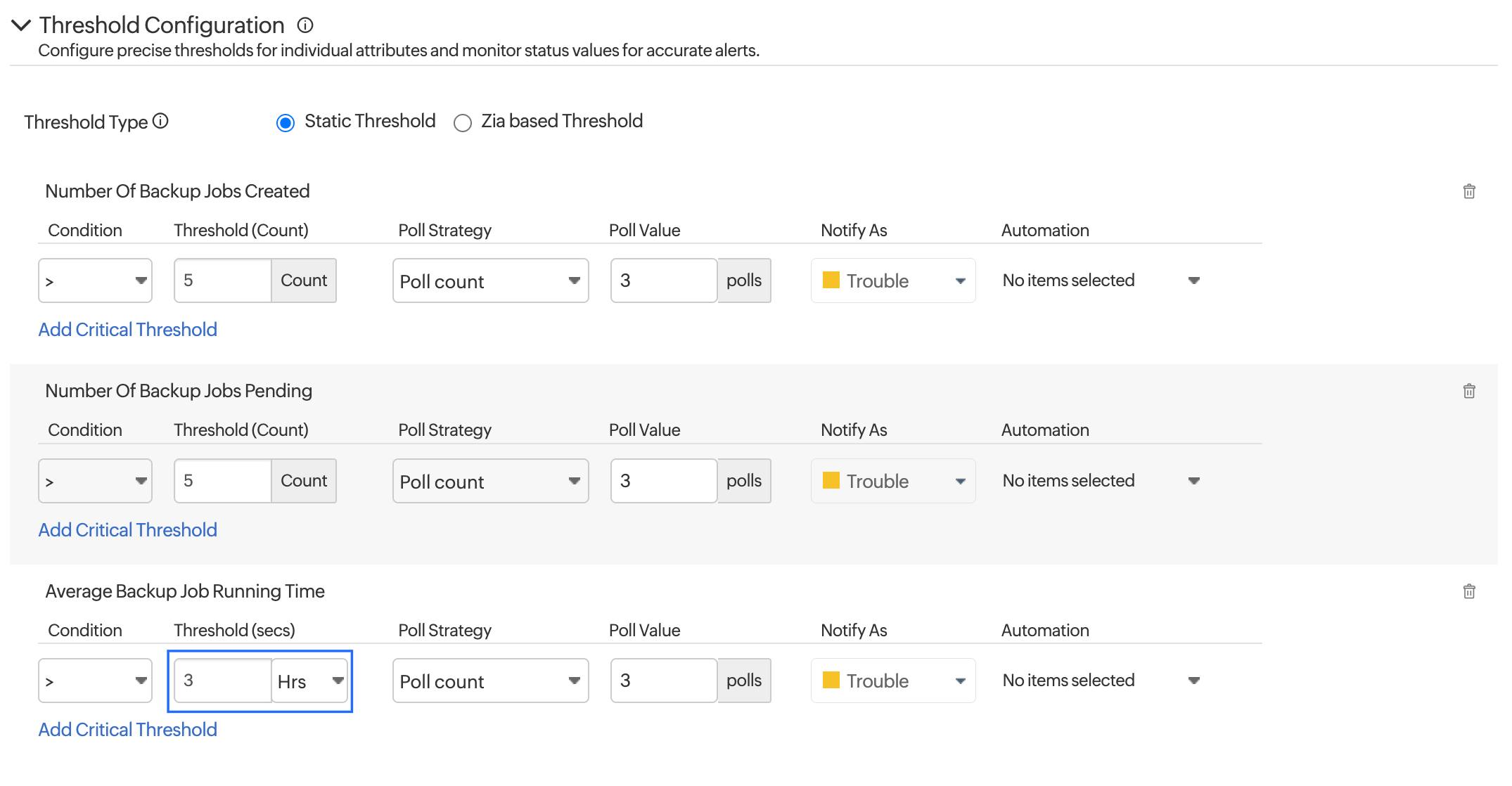 システムはバックグラウンドでしきい値(3時間)をミリ秒単位に自動変換し、メトリック値と比較します。アラートは、平均バックアップジョブ時間が3時間を超えた場合にのみトリガーされます。これにより、特に時間値が長い場合やストレージベースのメトリックの場合、閾値の設定が容易になります。