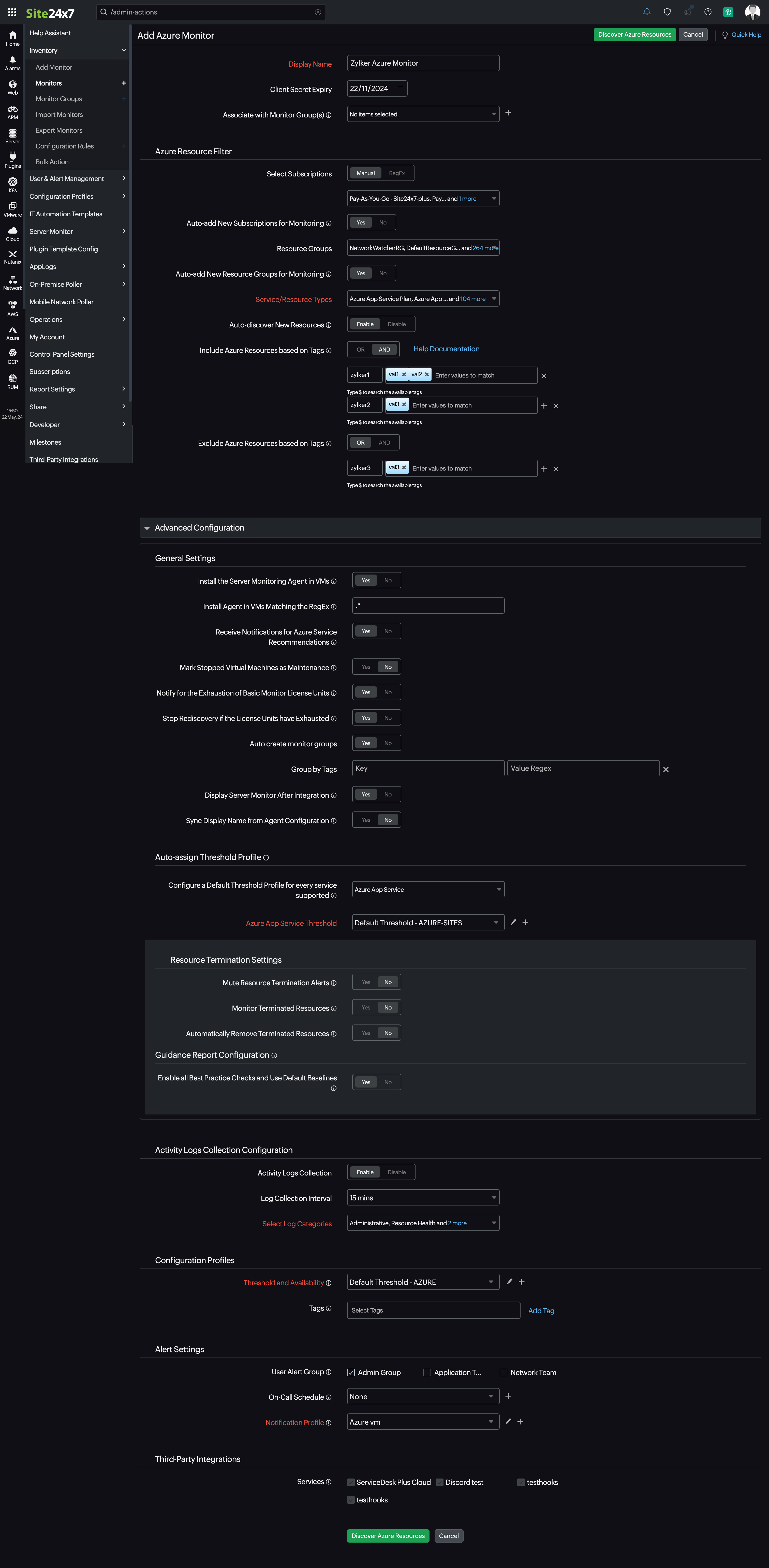 9. 既存の通知プロファイルユーザーアラートグループタグを選択、および新規追加します。これらは、以降のディスカバリーで追加されるリソースや、関連するすべてのリソース監視にも適用されます。各リソースに対して、リソースグループ、ロケーション、サブスクリプション、およびリソースタイプから成るSite24x7 Azureタグが作成されます。