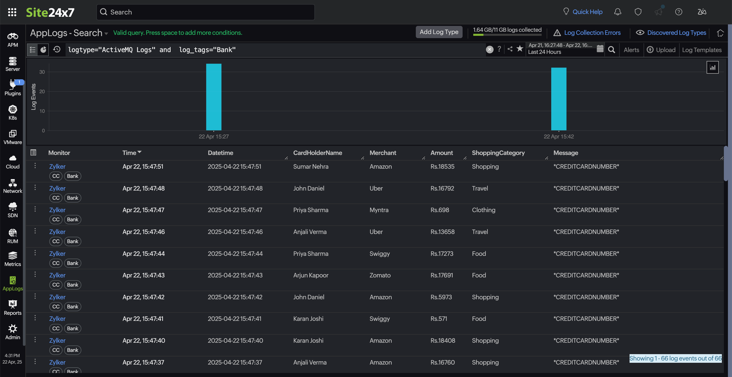 クレジットカード番号が含まれているログエントリの例は次のとおりです。