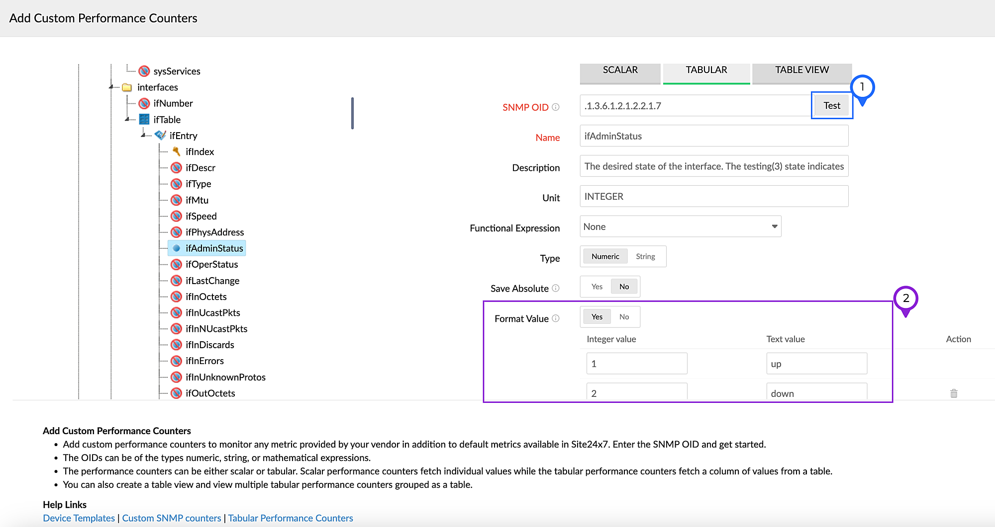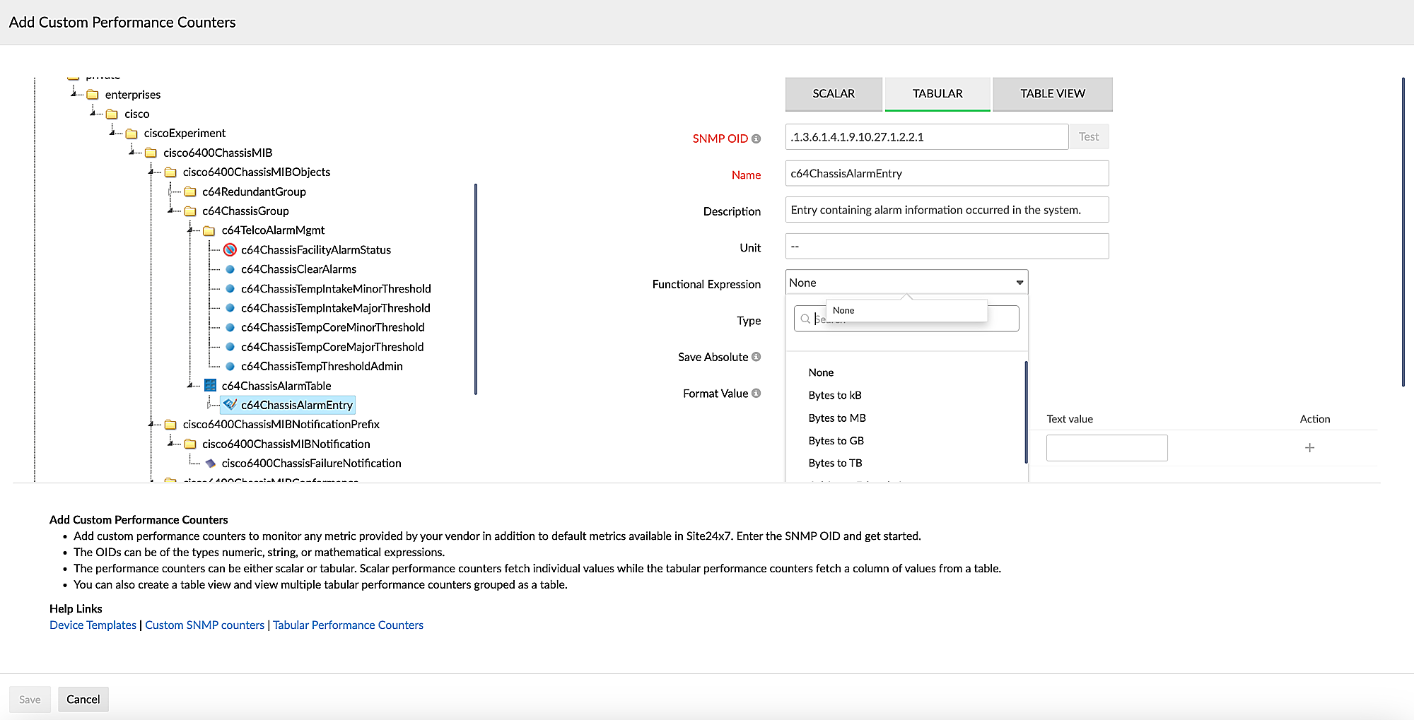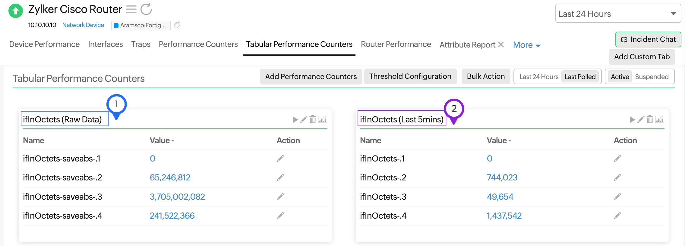 OIDの単位(またはMIBファイル内の構文)がCounterの場合、[いいえ]に切り替えると最後の2つのポーリング間の差として値が取得されます。[はい]に切り替えると、各ポーリングで受信した絶対値が取得されます。